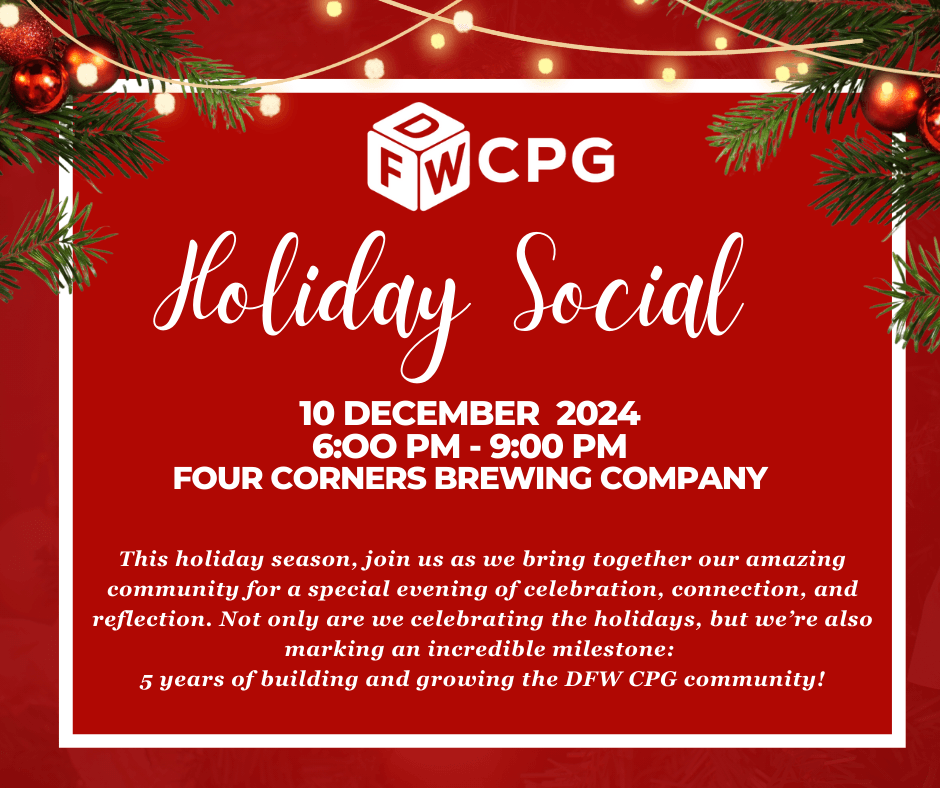 This holiday season, join us as we bring together our amazing community for a special evening of celebration, connection, and reflection. Not only are we celebrating the holidays, but we’re also marking an incredible milestone: 5 years of building and growing the DFW CPG community!